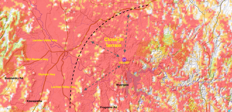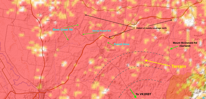 The effective mobile coverage of the 70cm repeater at Wally’s is hampered by immediately surrounding terrain to the north more-so than to the south. For example, the repeater is patchy in Cowra itself but once a mobile clears Cowra heading to Grenfell, the repeater is noise free until the gateway to Conimbla. There are some notable veins of coverage, like Frogmore road all the way to Boorowa.